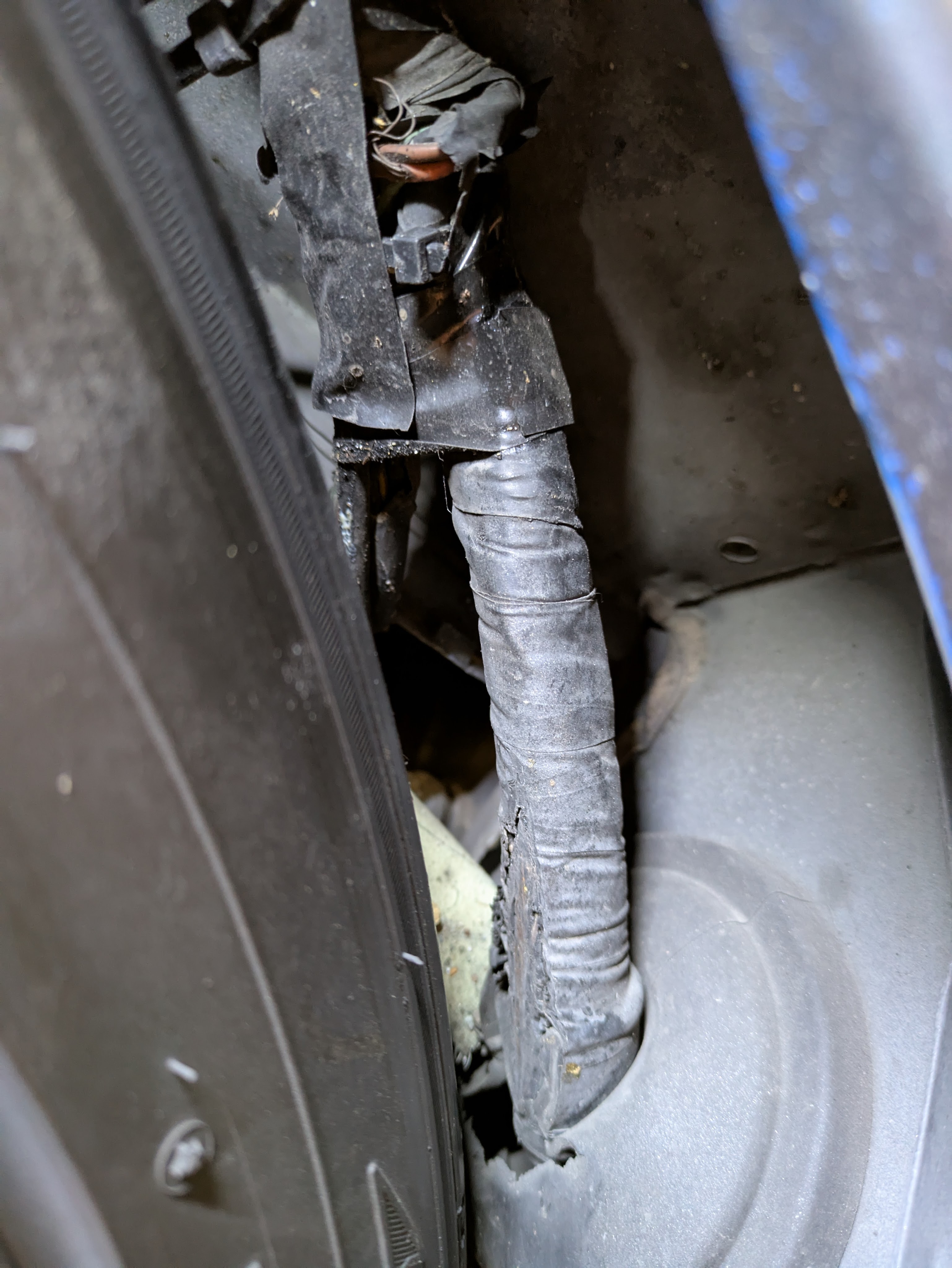 Upon further investigation, I got really lucky. It only had cut into 1 wire in the main harness, and only through the insulation of said wire. A combination of some liquid electrical tape, self vulcanizing tape, and one of those wiring protector plates, along with the imminent raising of the car and re-tucking the harness should solve my issue going forward. I’ve already confirmed some slight reorientation and a new notch in the upper strut tower rail should alleviate any future concerns.