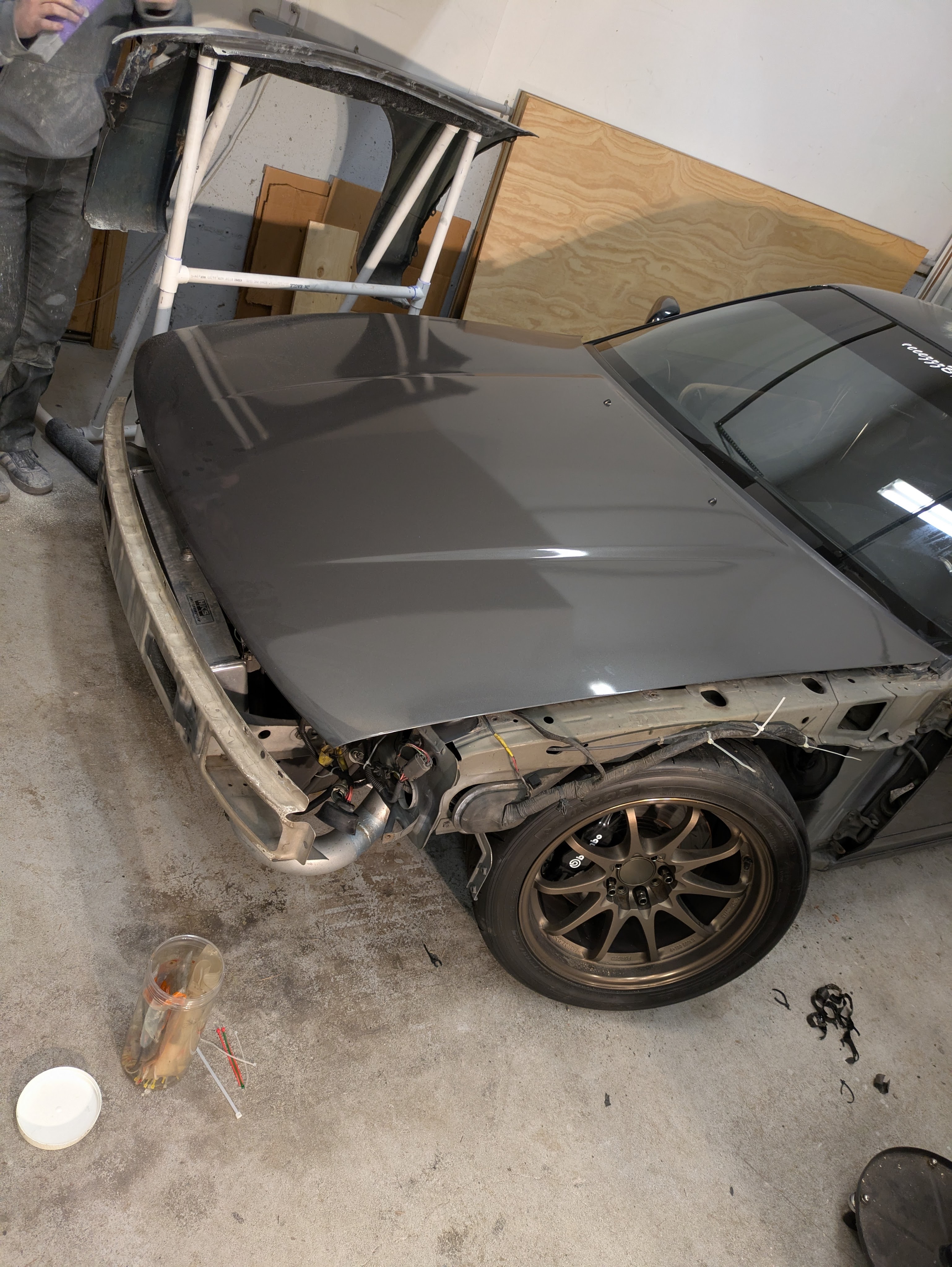 Now that color is laid down, the remaining imperfections with the panel are obvious. The massive crease in the front and the dings in the back were something that was discussed, but the council determined weren’t worth chasing. This is a track car that’s going to see abuse, and realistically, this whole car will get painted at some point. Its really easy to scrutinize flaws like that in harsh lighting at eye level, however on the car in-situ, it’ll still be the shiniest panel on the car. The imperfections in the top are now mitigated, which is the region that matters, and now it won’t rust. Overall win.
