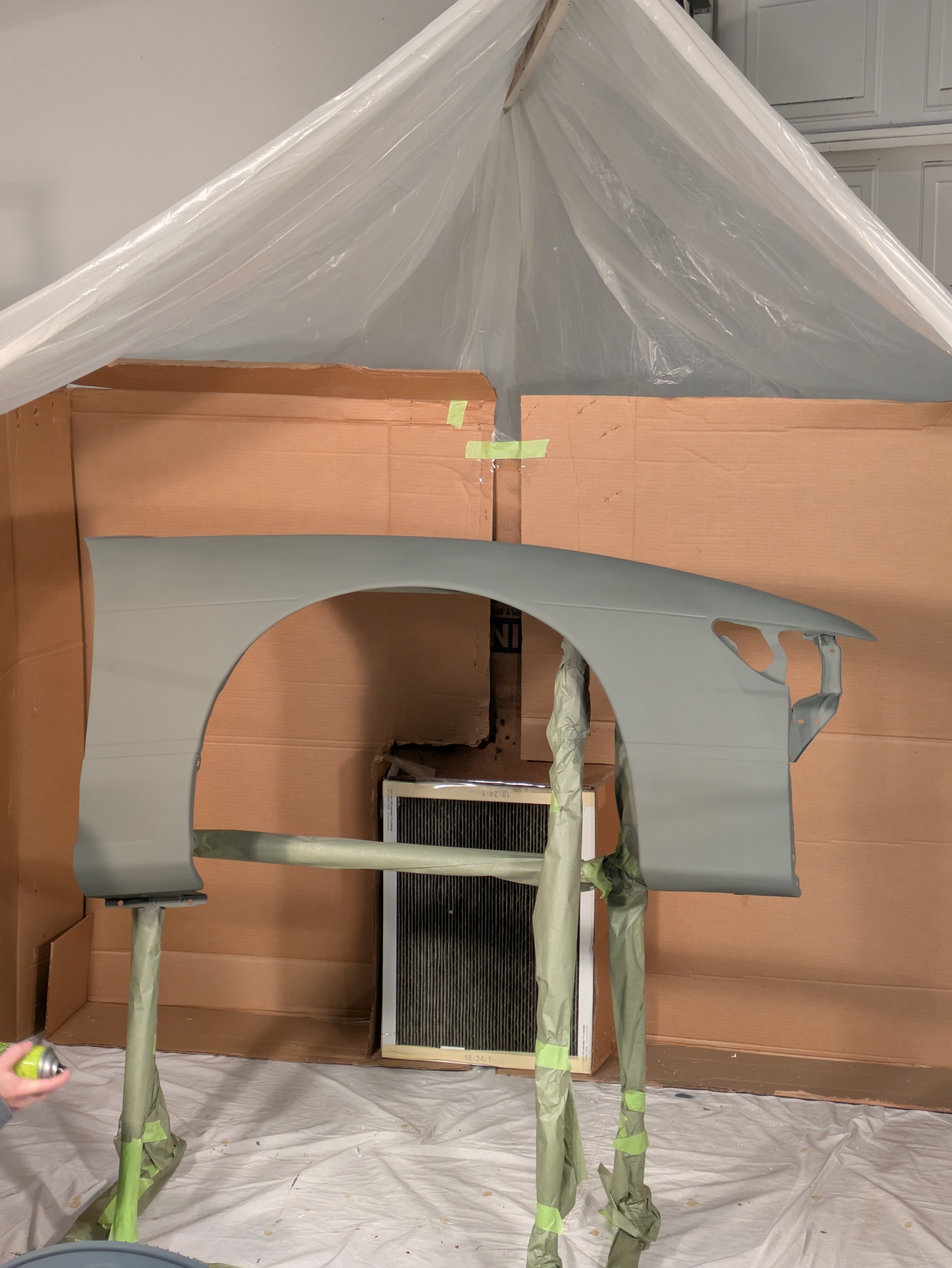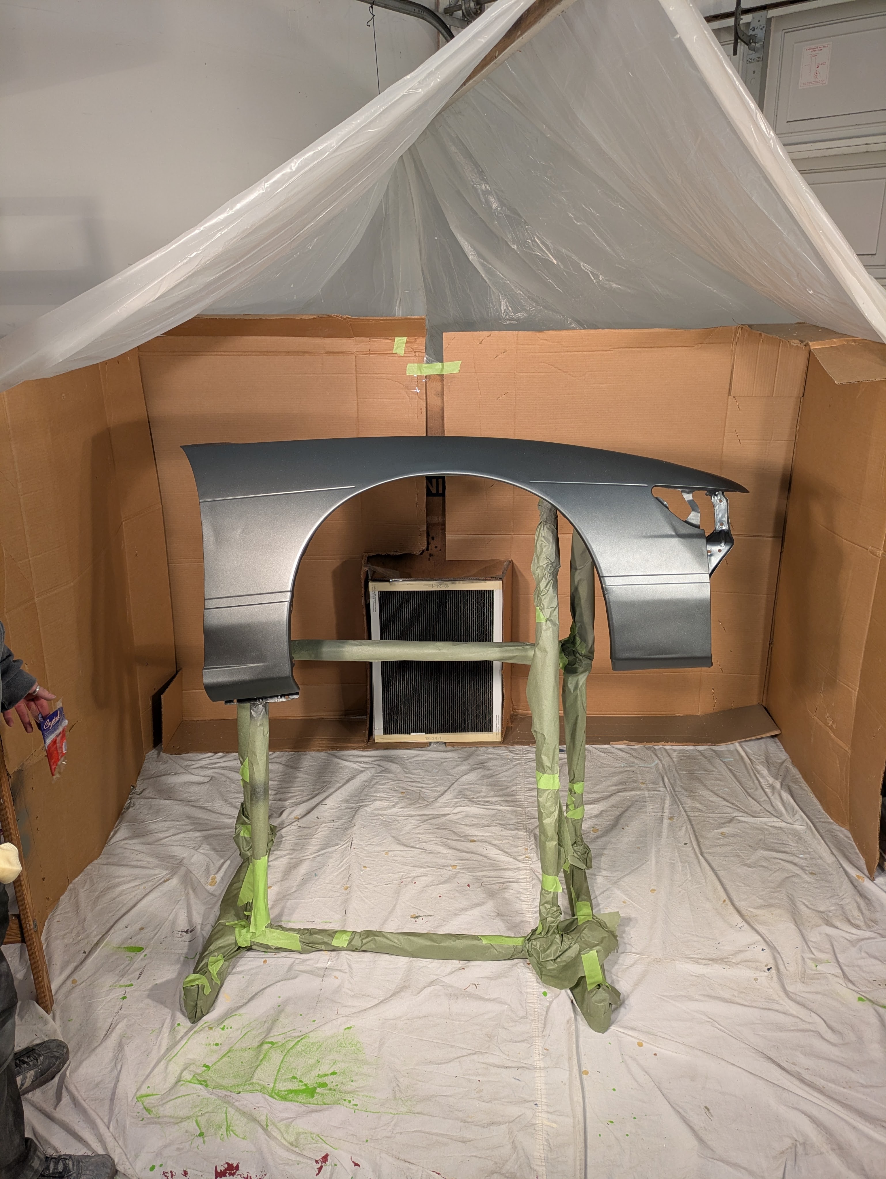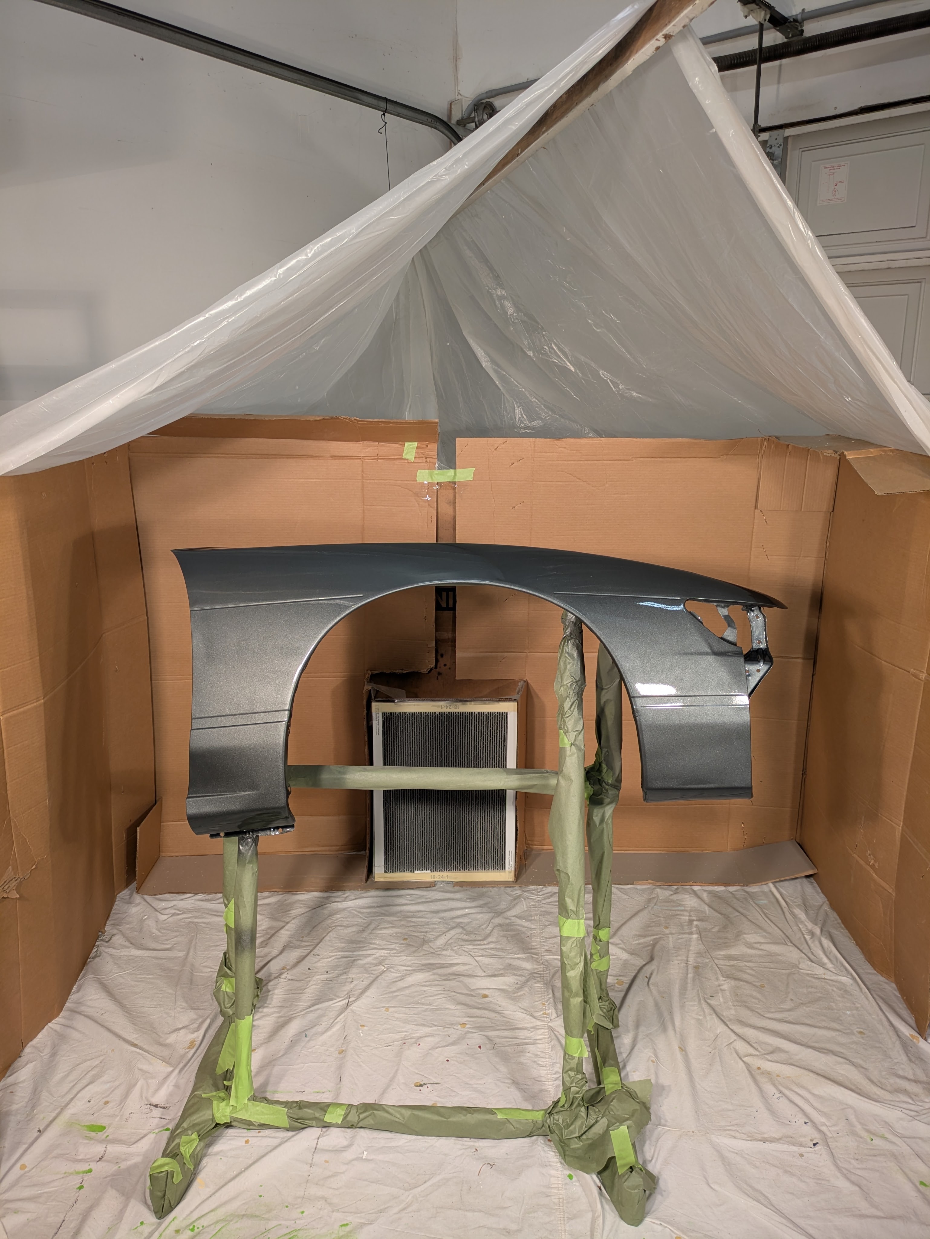 The filter in the back is for a box fan hidden behind the cardboard, making it a negative pressure “enclosure” in an attempt to stop overspray from going everywhere. The stand is the hardtop stand for my Miata, and with some clever use of rope, boards, and ladders, it actually netted a workable setup.