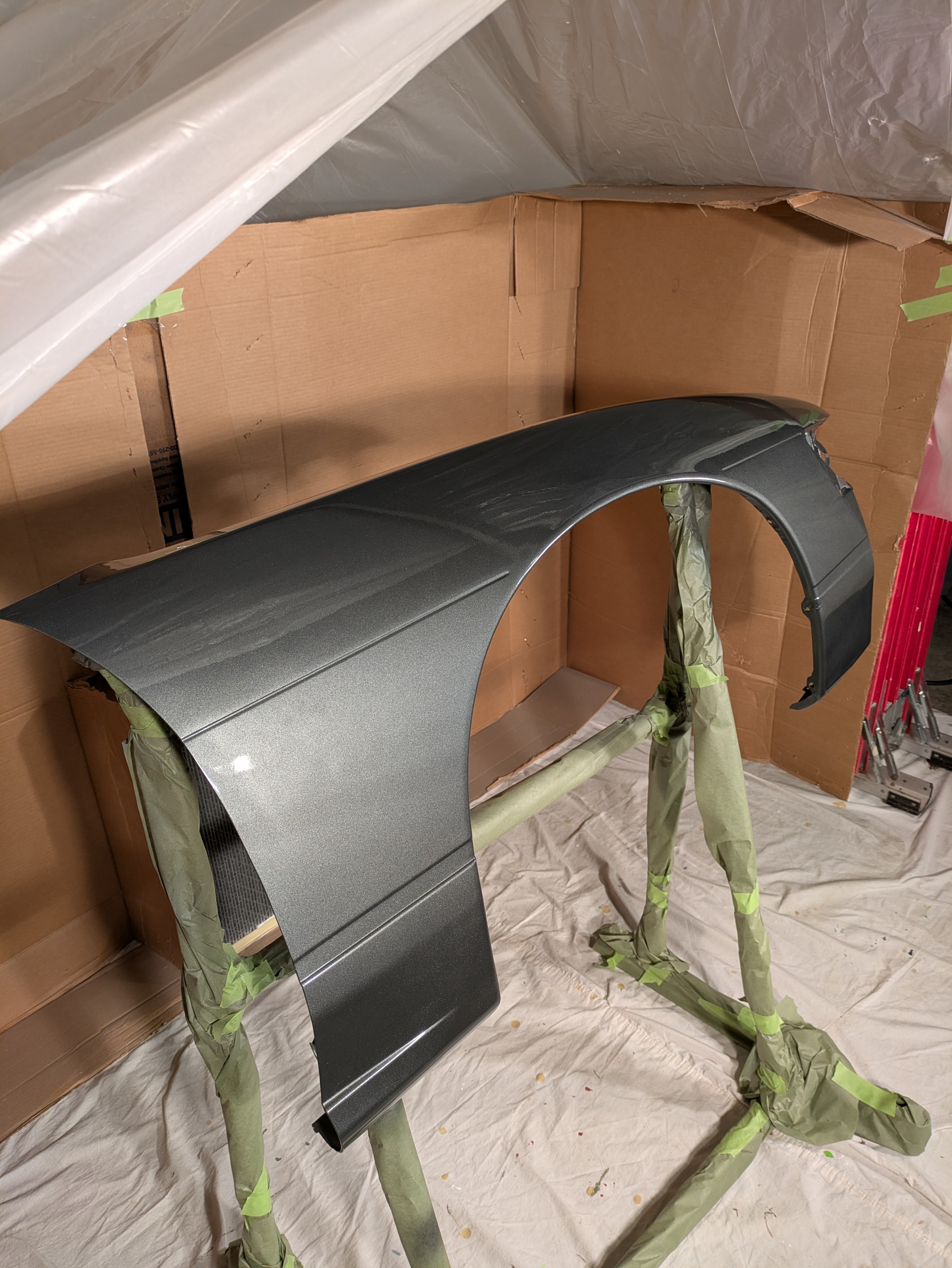 This is the next day, with the other fender for comparison. The difference in color match is there, but not extreme. I am now wondering if the color of primer was the influence in that, as a darker primer may have been able to knock back the brightness a bit, but I really can’t complain. For a whole process that was about 8 hours start to finish (helped that the fender was already bare metal), it turned out super well. Fitted on to the car, in the sunlight will be the true test, but I’m happy with it.