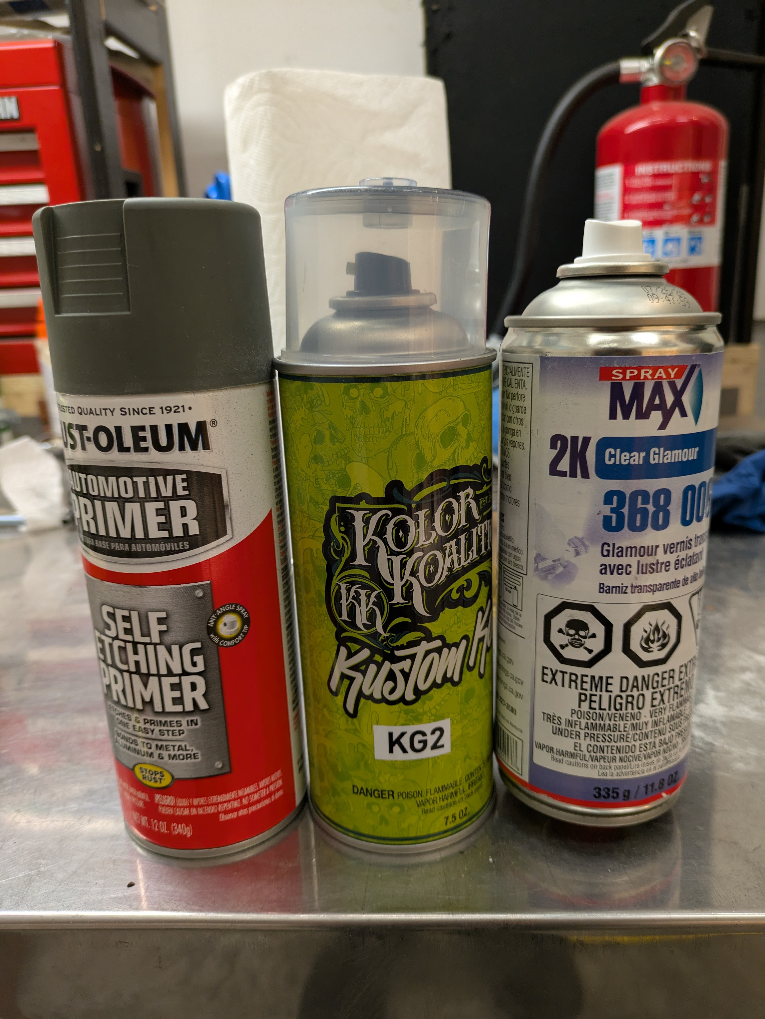 This is the stack of products we ended up with. The Rust-Oleum was purchased by my sister day of, just because I wanted her to get what she wanted for the situation. The Kolor Koalition and SprayMAX, as well as a kit of supplies not shown, was purchased from thetouchupshop.com. Fairly established outfit out of Vegas that had a very easy to navigate site with well considered kits and a really simple colormatch tool by year/make/model. If I have my pick of companies for a certain product, I’ll usually go for a combination of reviews and how fleshed out their “About Us” page is. They also gave great directions for flash times of the aerosol products they provide. Quick shipping and fair prices sealed the deal, and I also ordered touch up paint for every vehicle I own from them. Might as well.