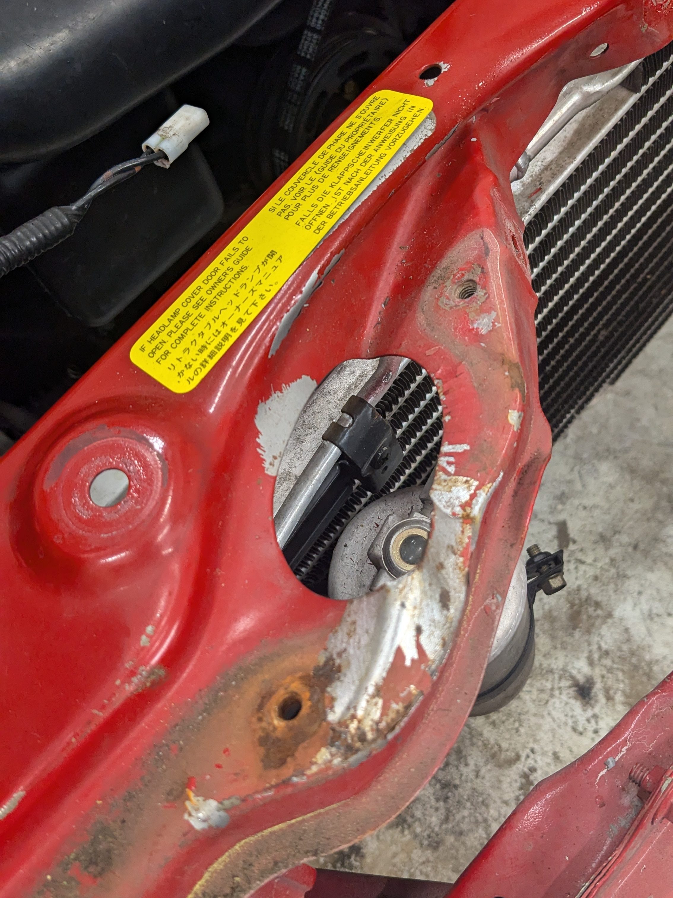 The photo above is of the driver’s side apron, which you may note if you have eyes, was not part of this crash. I knew about this damage from the previous owner (fully disclosed the reason for the rebuilt title, as well as pointed out the damage before I purchased it). Due to the severity of the core support damage, I figured that it would be an appropriate time to also improve this area. If you are familiar with Miata construction methods, there are two metal interface tabs, one that interact with the metallic bumper support, as well as a tab that intersects where the bumper and fender meet to give it some rigidity. Both of those were not aligned due to this damage.