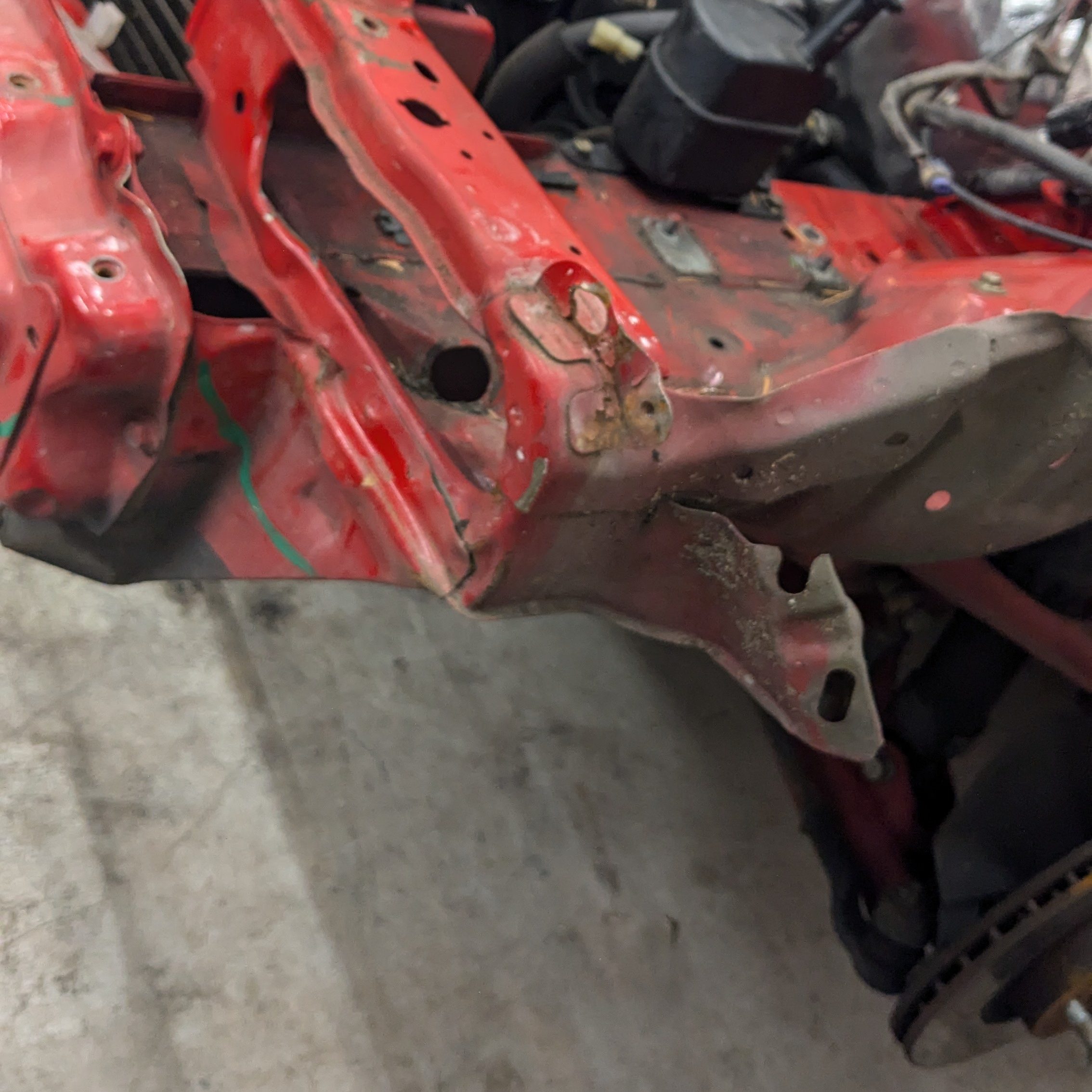 As luck would have it, right when I was feeling ready to really kick this project in the ass, the collision center was having a slow few weeks, so side/supplemental work was doable. First order of buisiness was geting the core support and apron straightened so all the panels would fit correctly. One of the frame techs, Body Juan (we have to distinguish him from Paint Juan), did a 1 day repair with more than expected coverage for a very fair price. I dropped the car off Friday night and picked it up Sunday morning.