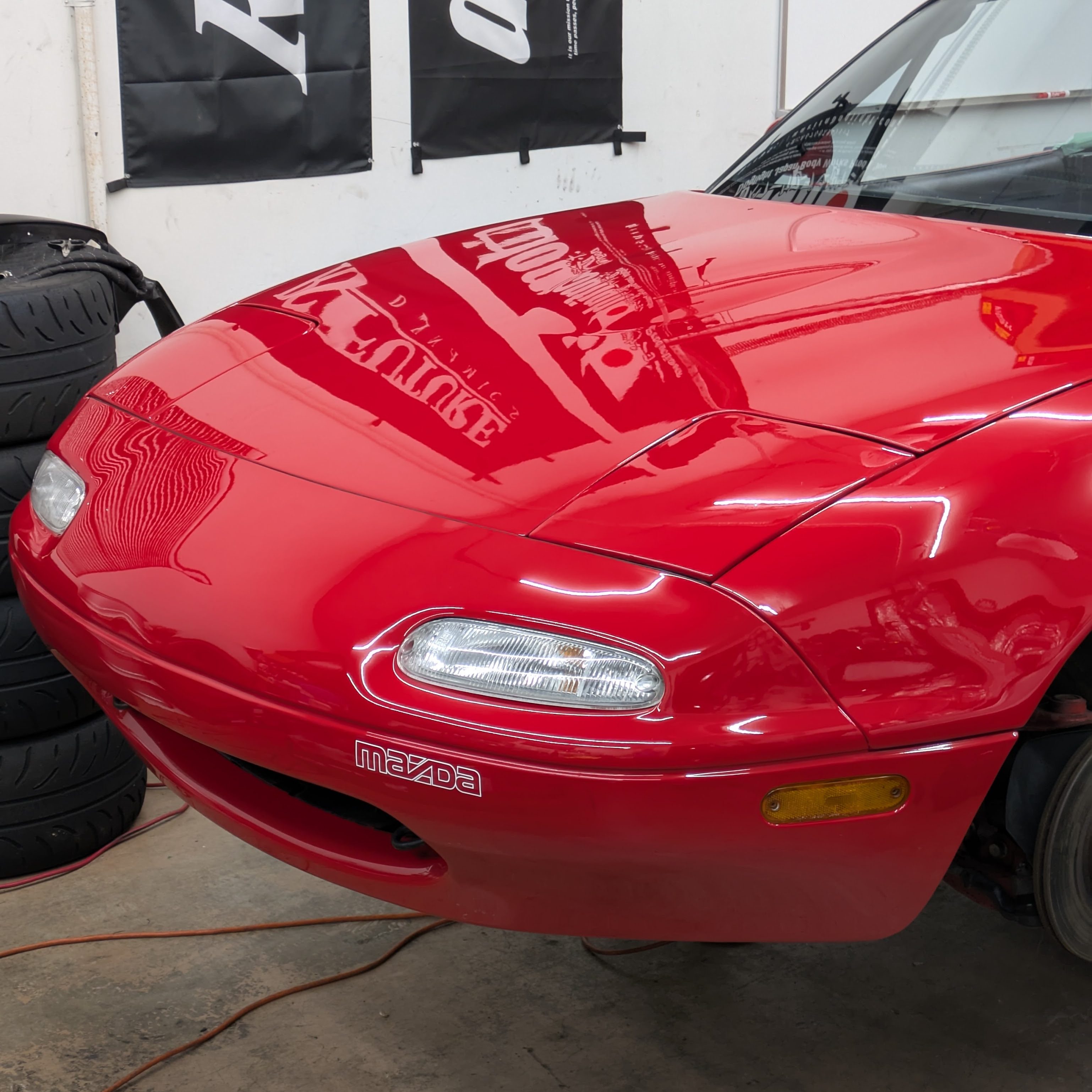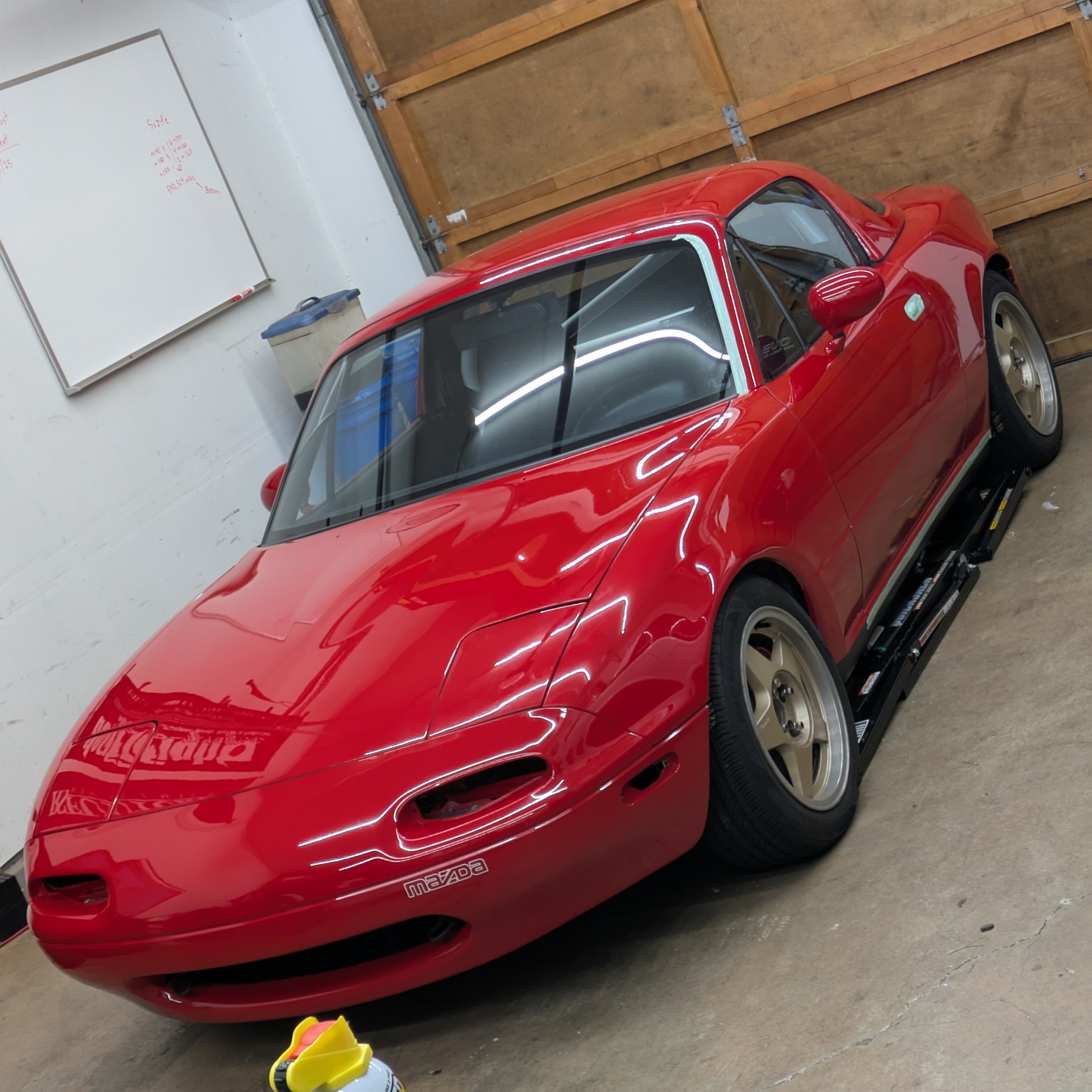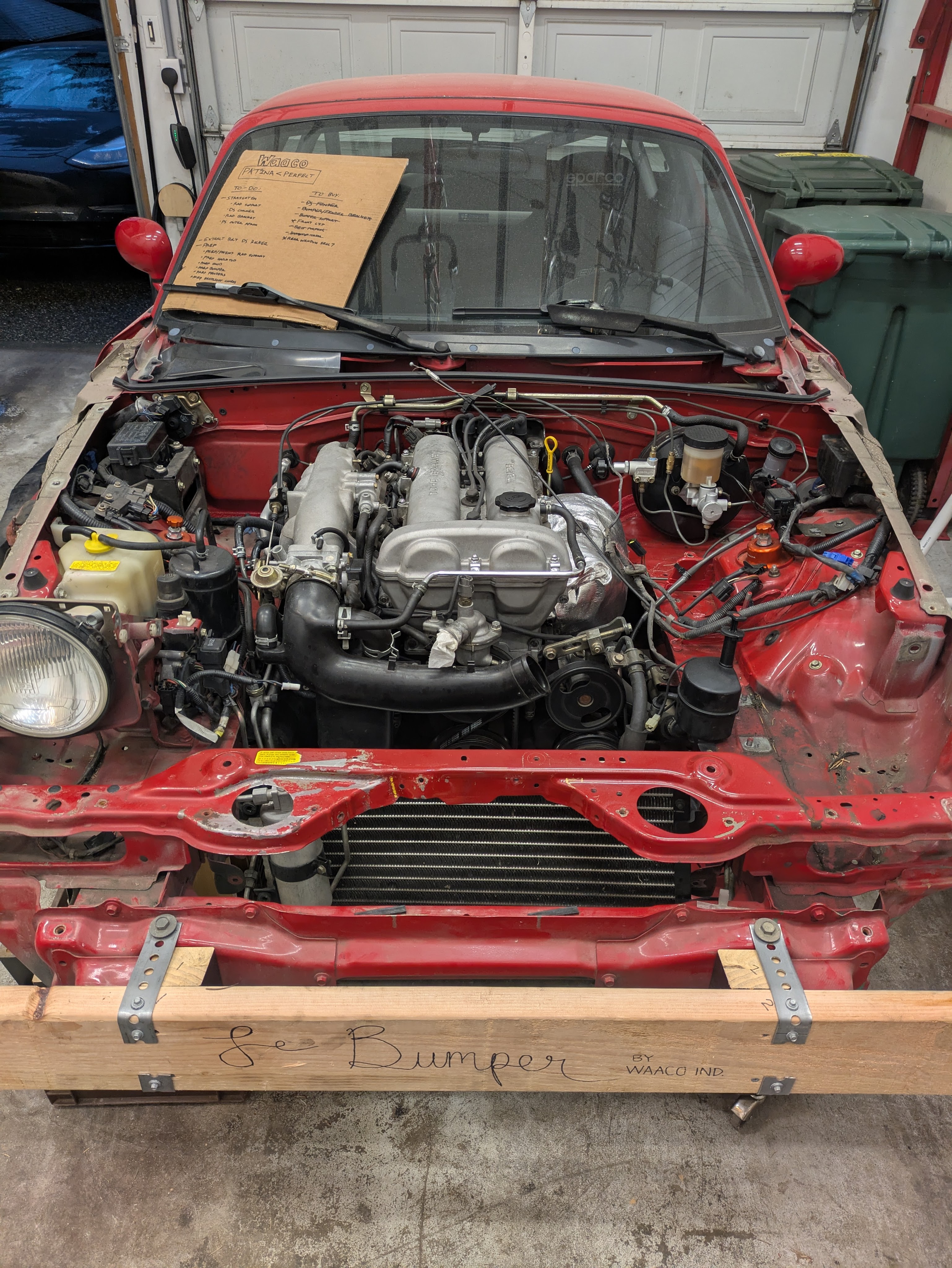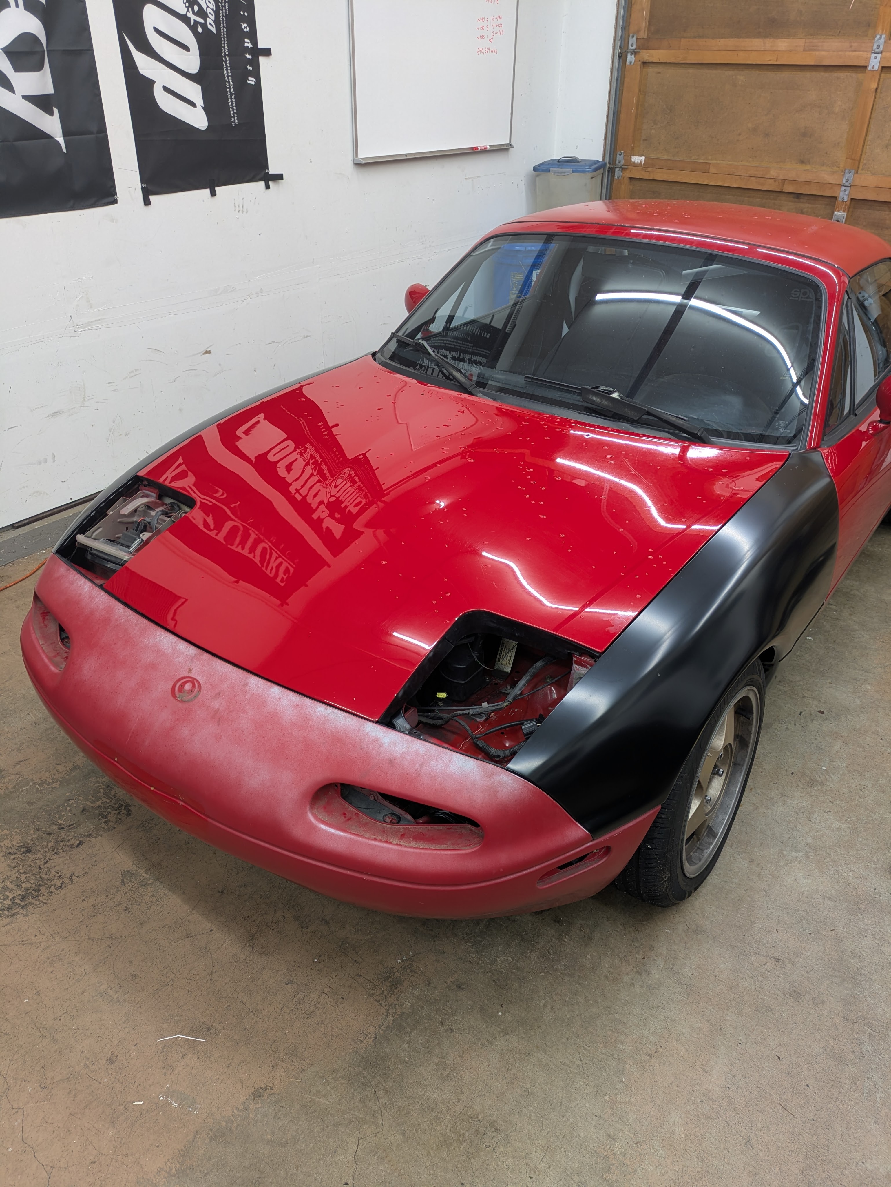 Once it was back home, it was swiftly draped in panels in preparation for paint. I had purchased brand new fenders (Tong Yangs via Summit) which actually fit really good for cheap Chinese fenders. My previous set was really hammered, and if the car is going to get painted, I want the final product to be worth all of the money invested. The bumper was a used unit from Marketplace that unfortunately had both badge holes and the classic license plate dimples. The really painful part was the bumper did not include any of the internal metal framework, and mine was both corroded and bent beyond saving in the accident, so I gave Mazda many of my hard earned shekels to replace all of that with brand new bits. Do it once, do it right. Big thanks to Joe over at Mike’s Miata Parts for help procuring all the stuff. Highly recommend them for excellent customer service, as well as product pages with highlighted OEM diagrams and descriptions of what the parts do AND where they go.