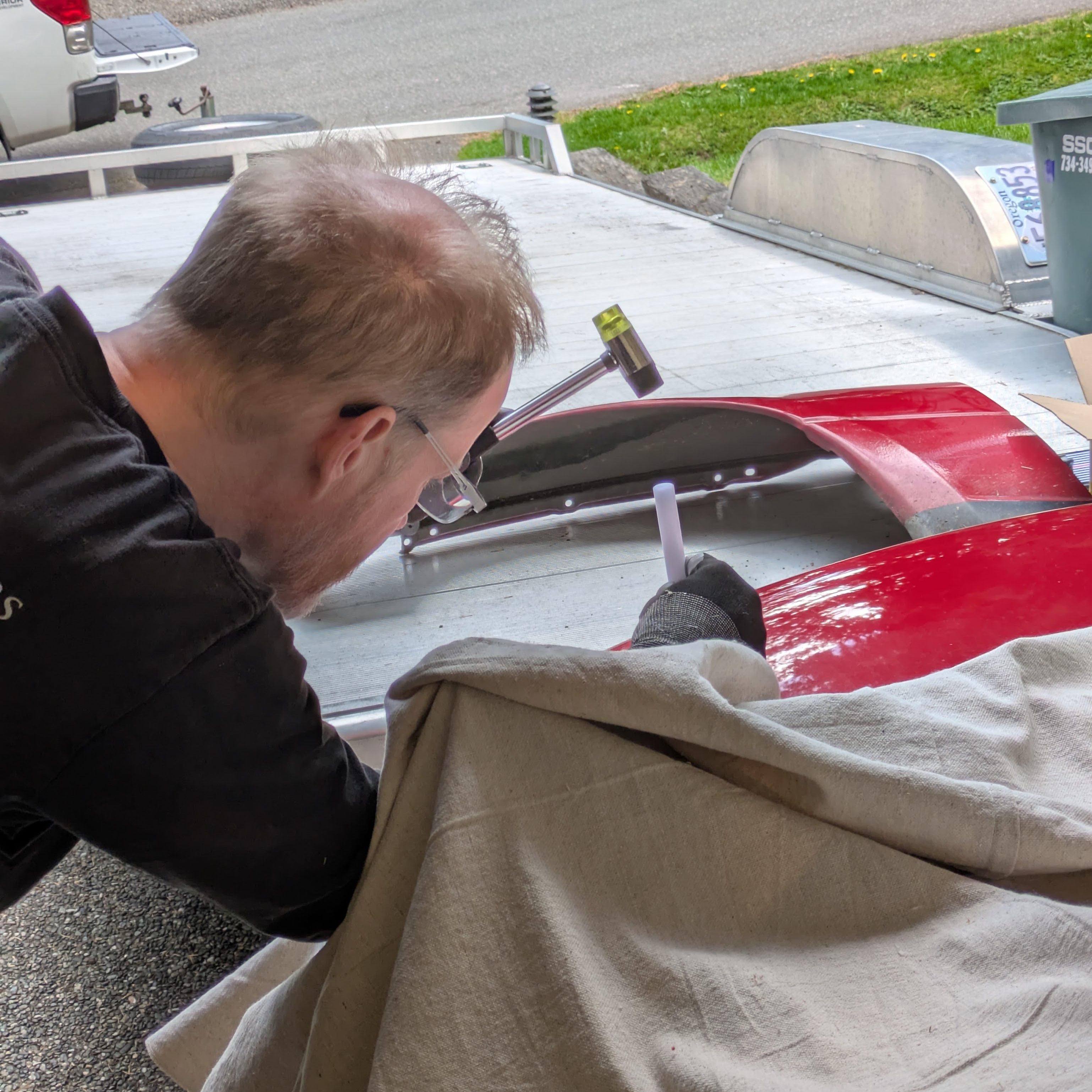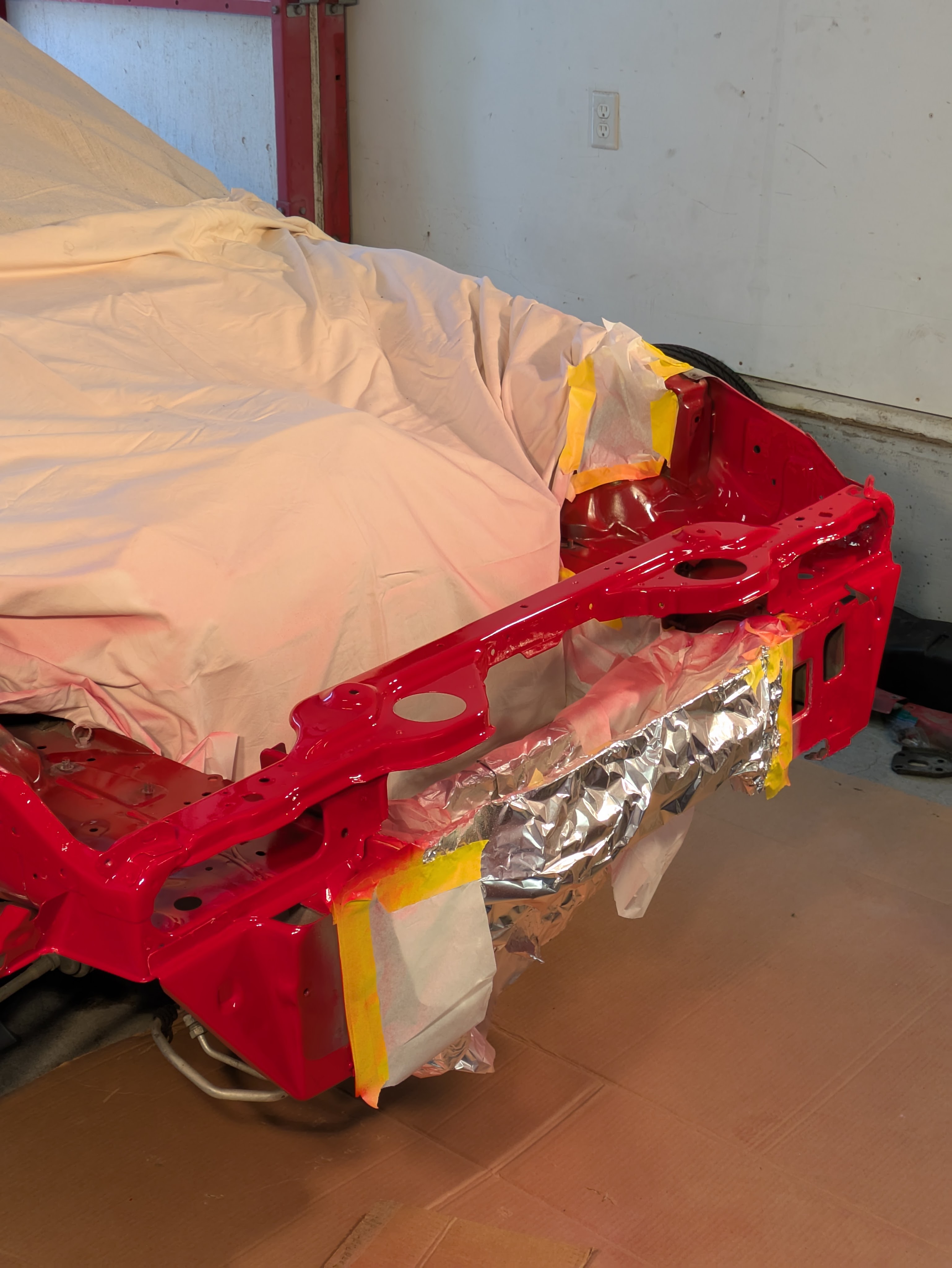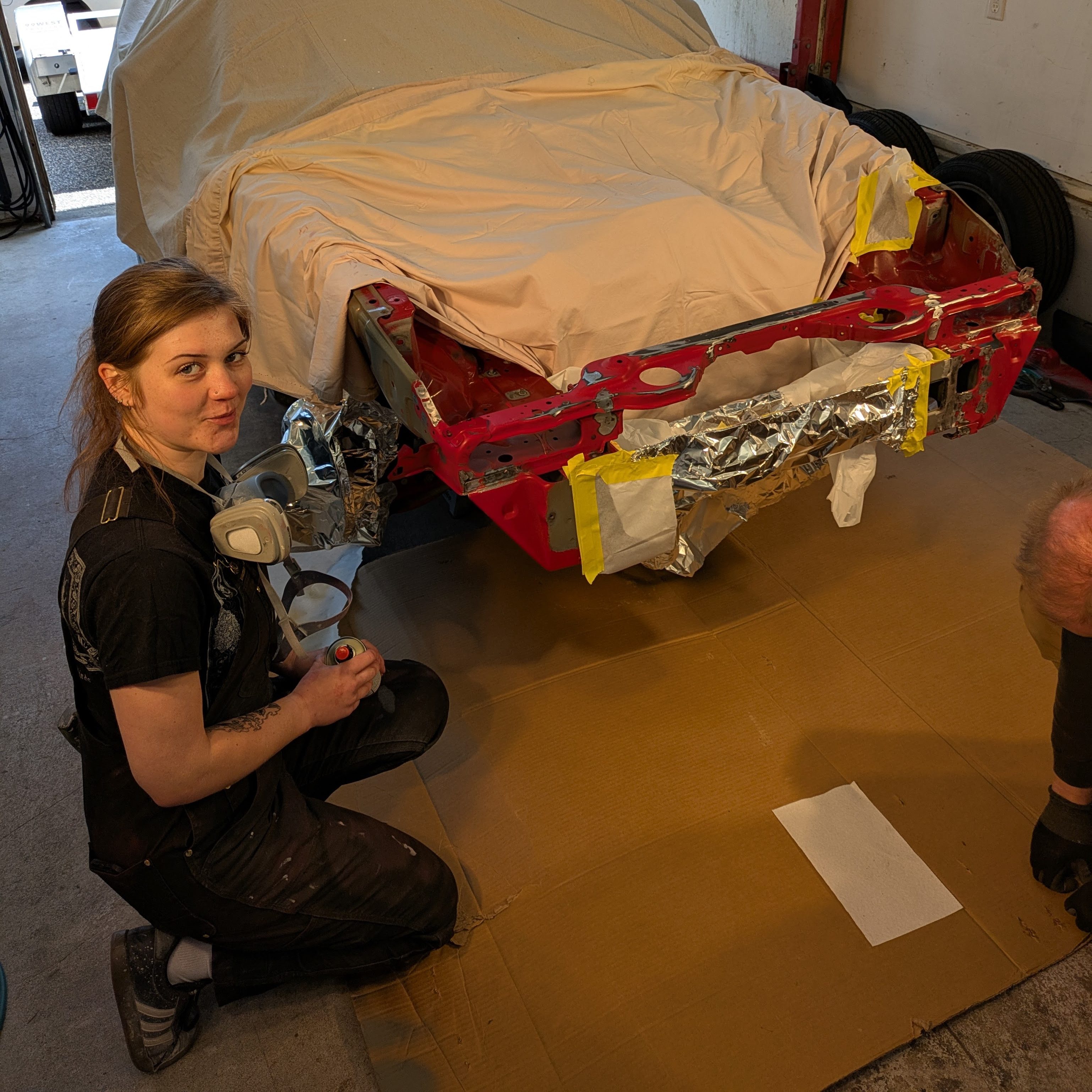 While I was away for the day (towed up Thursday, it’s now Saturday), Ed had spent time in the apron with a hammer and dolly really perfecting the already excellent work that Body Juan had done with the frame machine. Different levels of patience for little creases between the two laborers, but the combination was excellent. On top of that, my sister had come through to mask and prep the area, and I held up my part of the deal with materials.(and later food, the really important part)