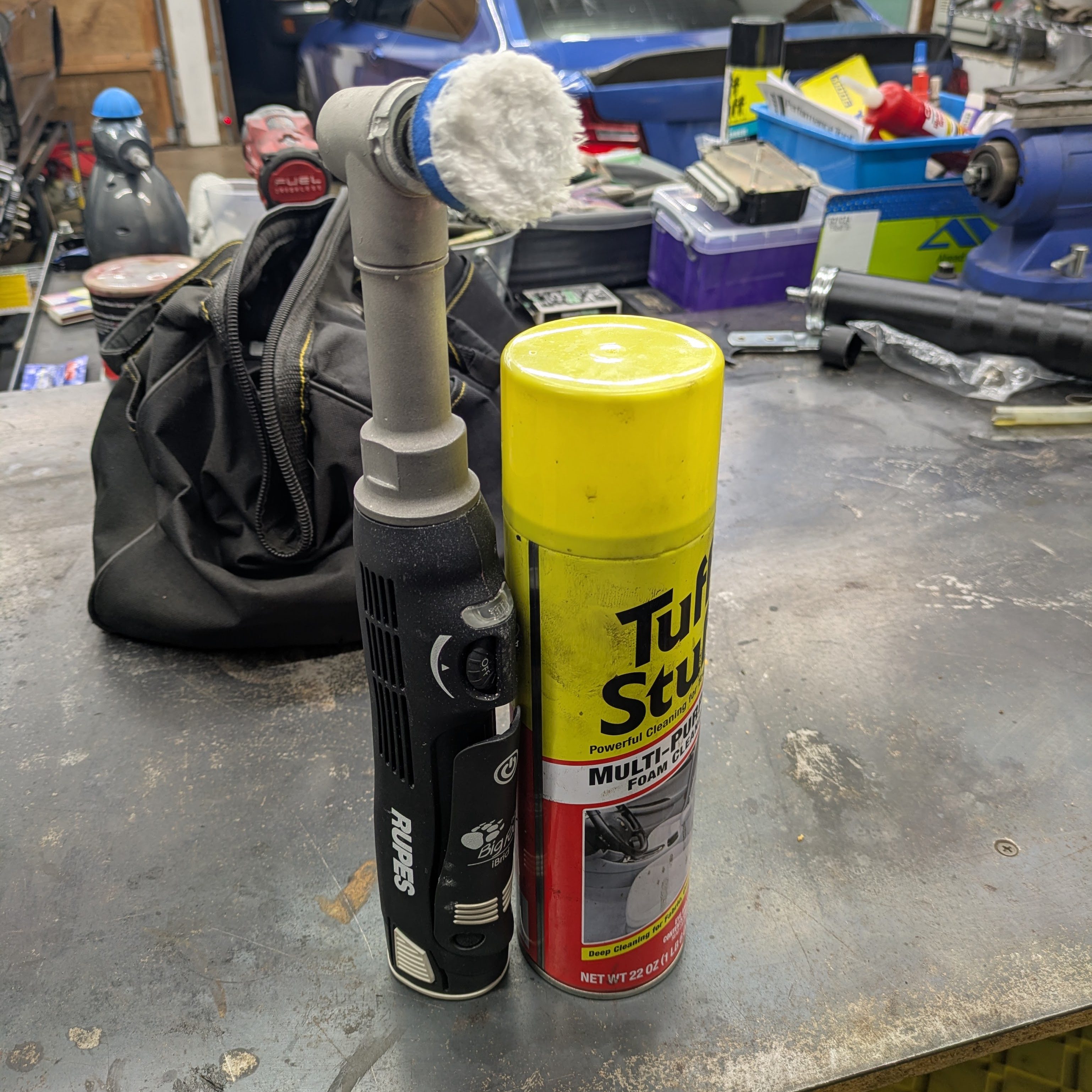 I had seen a few years ago someone using a 1″ rotary polisher and a microfiber pad to clean a headliner, and I figured it would be my best bet as it would minimize pressure and volume of cleaner required to clean it up. I sprayed Tuff Stuff on the pad, and in a few passes (hardly took more than a few minutes), I had a factory fresh headliner.