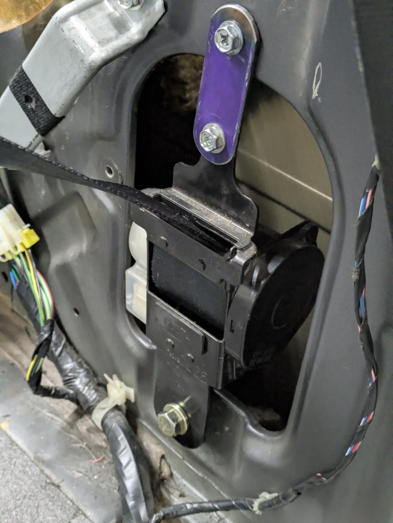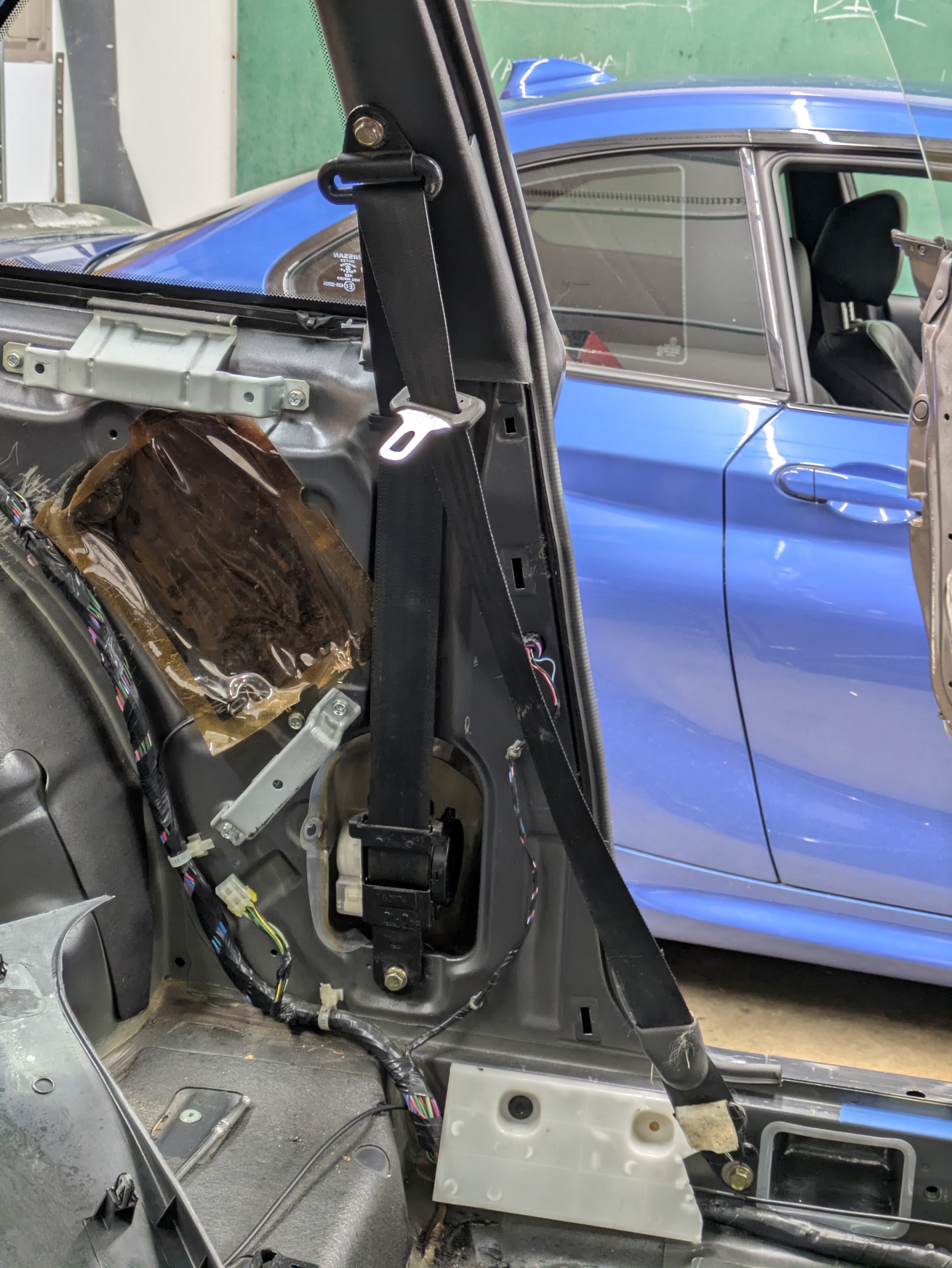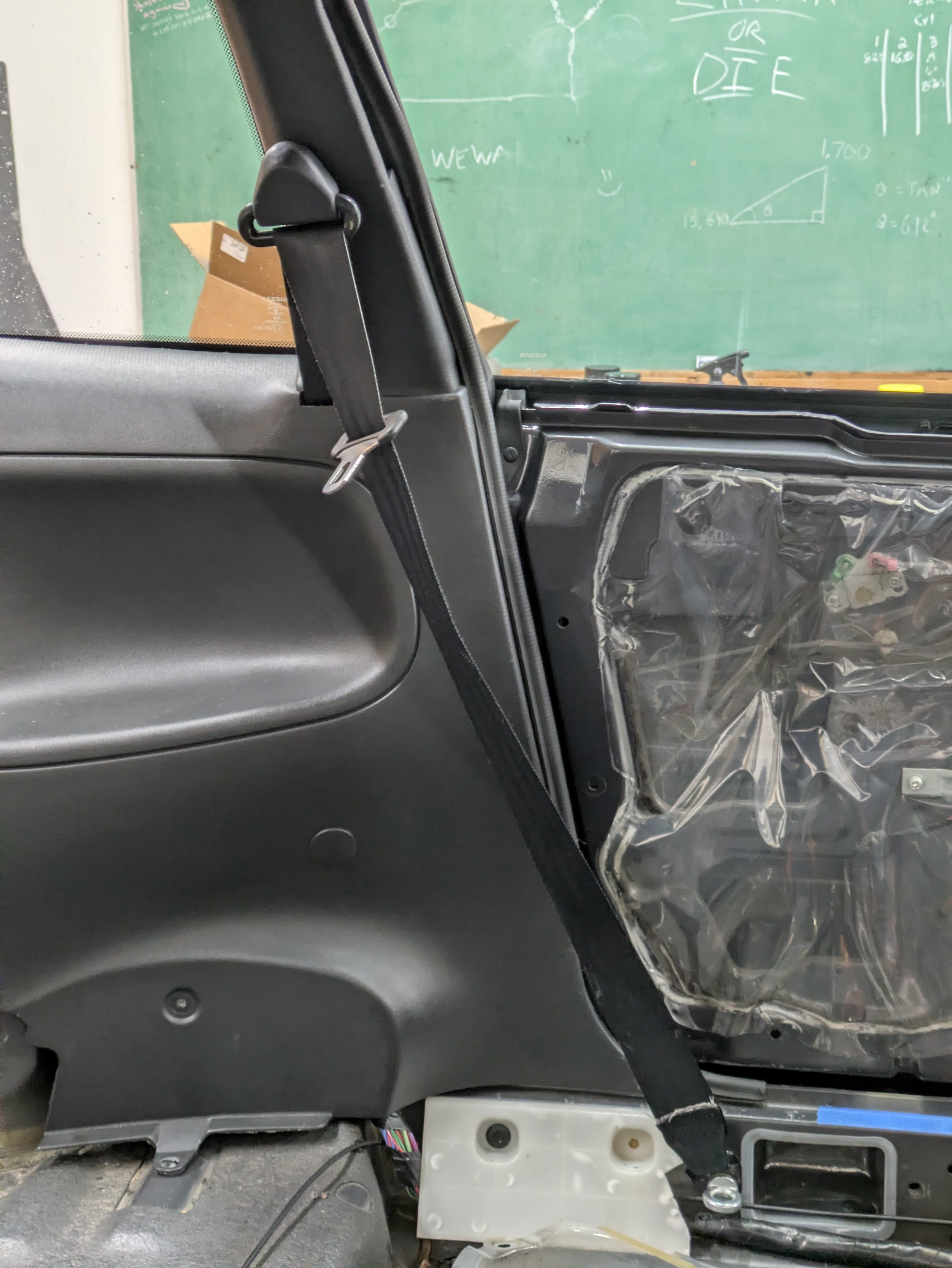Minus punching the hole in the B pillar panel, this was the very first test fit of the seatbelts. Rough, but a good proof of concept. I did a poor job of capturing it, but right behind the buckle in this image is a little plastic belt manager that clips into existing rectangular holes on the S13 chassis. This little piece is critical to belt routing, and I’m glad S14 ones are the same as it made it wayyyyy easier to deal with.