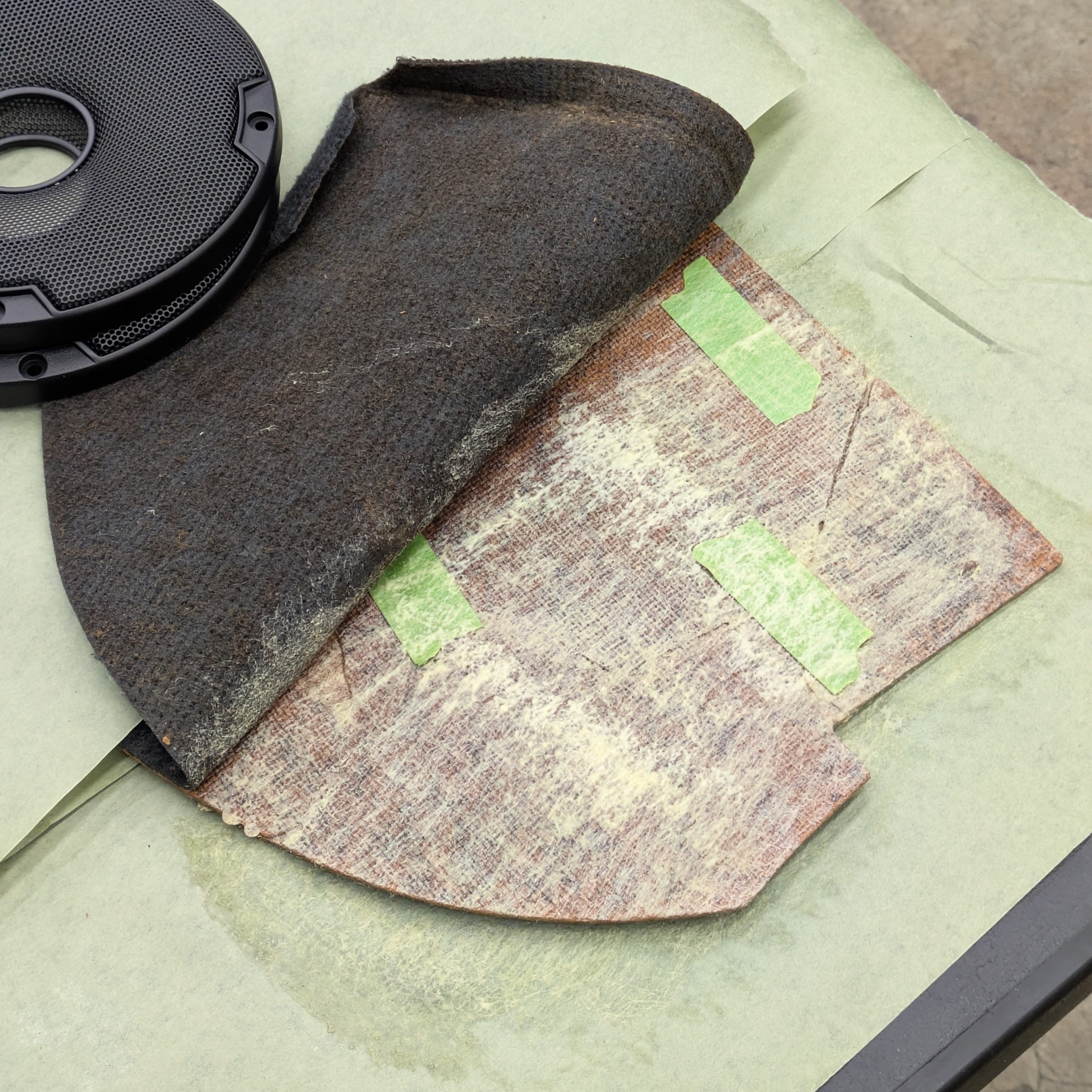 A few months back when I was still actively driving the car, I went to remove the rear deck with the half cage in to diagnose why the audio sounds so terrible, only to detonate the package tray trim on one of the corners. I didn’t know at the time that you can get to all but 2 clips from the trunk, and this was the corner that was behind my head while sitting in the rear seats, and the 35 year old particle board made itself known. I was very bummed and debated just outright replacing or remaking a whole new one, but after looking at it more, and with some encouragement from my father, we decided to just glue it back together.