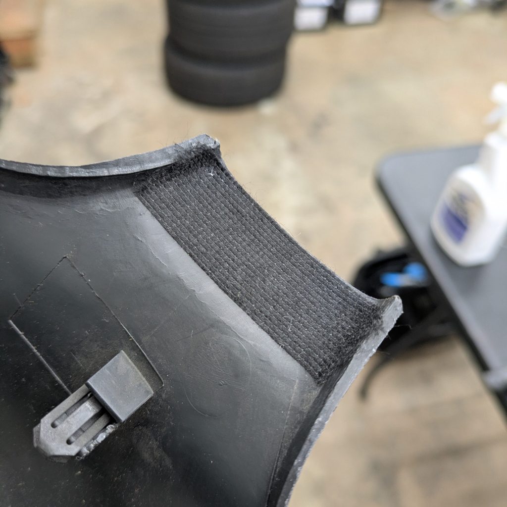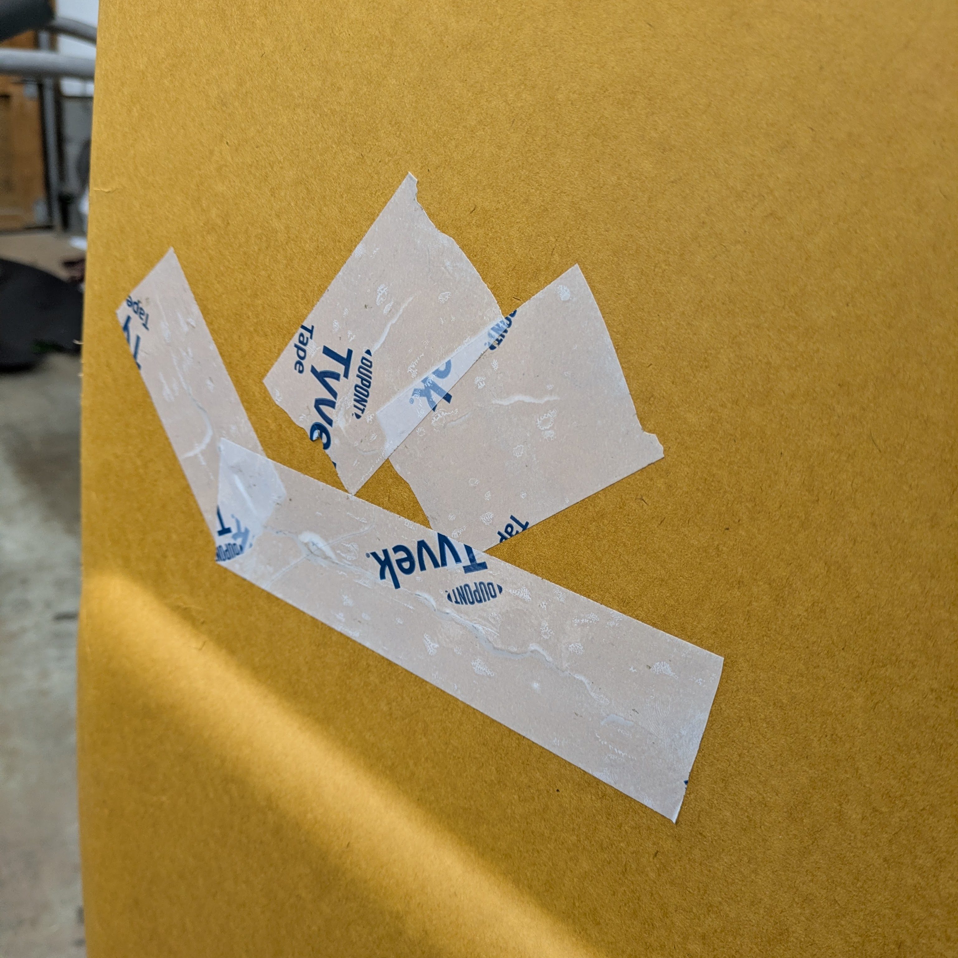 This ended up being the final deployment of clamps and blocks to get the parcel shelf back into the right shape. We were able to find most of the small pieces to bridge the junctions, but some of them had turned to dust when it blew up, so we had to leave some voids. Critically, most of the clip locations were still fully intact, so we knew it would be plenty structural when it was back together. The glue we selected was Titebond III for it’s temperature tolerance and cured strength, and the wood blocks had Tyvek tape on them to prevent the glue from bonding the blocks to the package tray. The whole thing was creatively propped up on boxes to ensure that there was no stress, as the rest of the tray was still super tender.