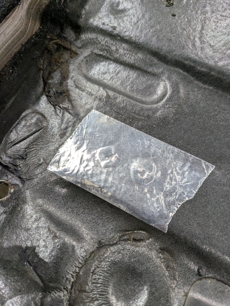 With the carpet reattached, I also reattached what was remaining of the insulation material that pretty much fell off when the package tray came apart. Nothing special, same 3M 90 adhesive, and it worked perfectly. You can see the little green tape pieces peeking through on the nearside clips. They did their job perfectly. I ended up touching up a few other areas of the carpet that were peeling up, and you can’t tell that it was multiple pieces at one point.