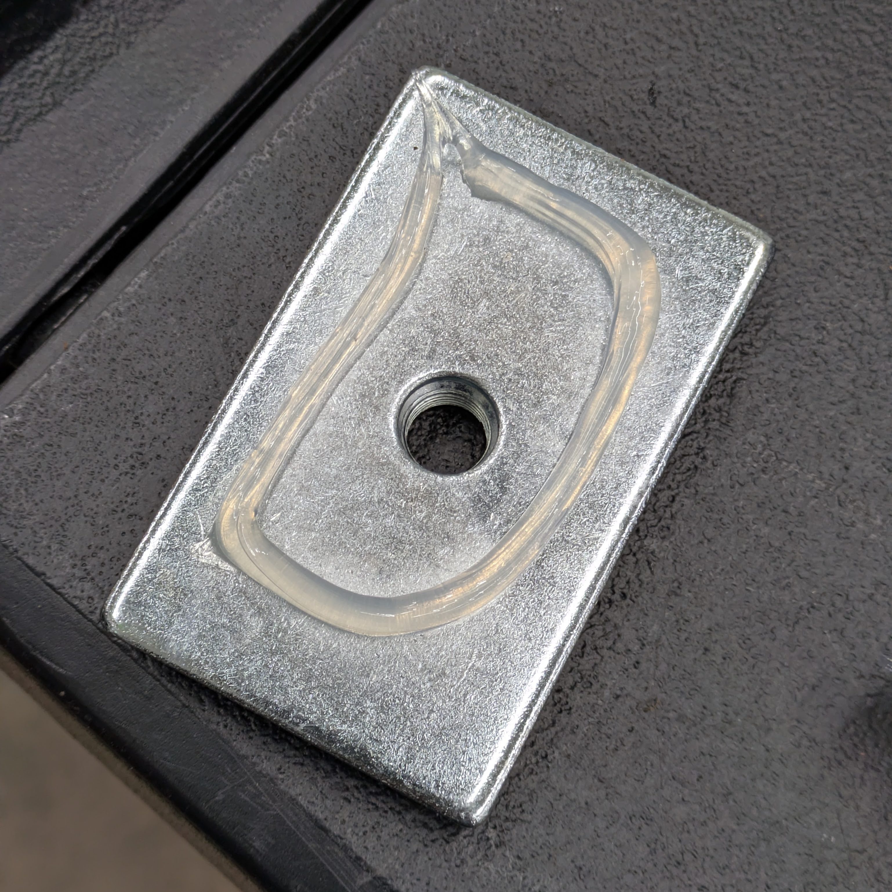 After the test fit, the plates were smeared in silicone sealant to seal them to the floor. I did this with all the previous harness install points, as had the previous owner when he put various plates in for the cage and harnesses. I also went back at the end of the night and sealed all of the fastener heads/threads so that water cannot ingress through any of those points.