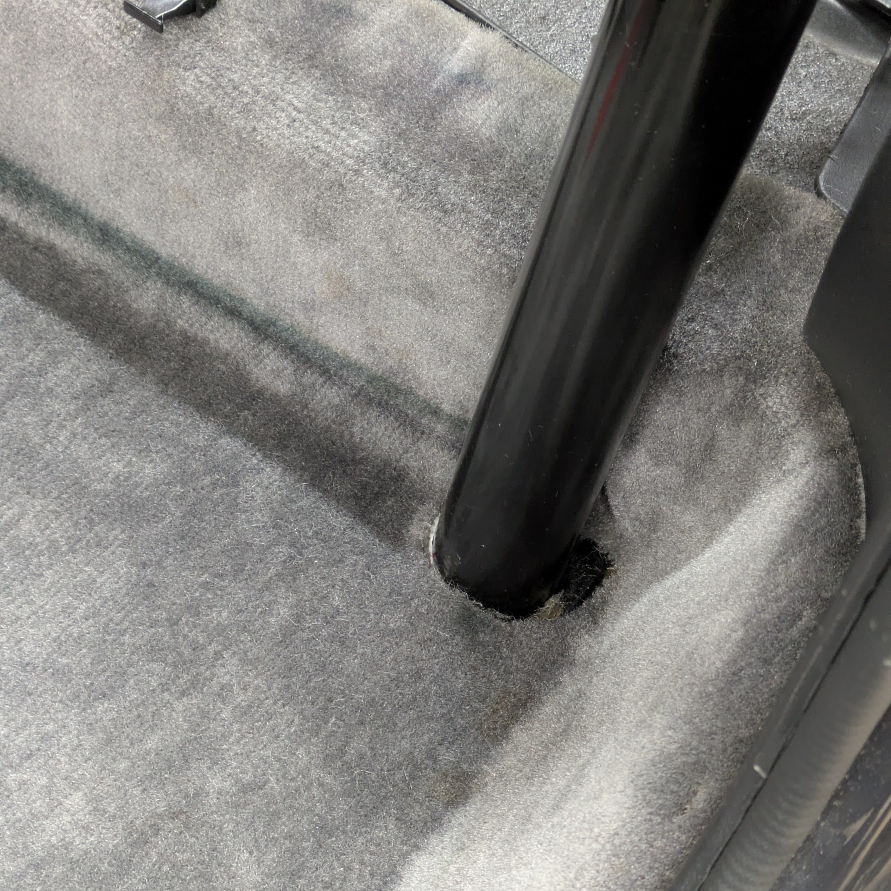 With the carpet set in the car and secured to all of the hard points, we began trimming around the harness anchors. We just cut the rectangles for the heads of the eyelets to poke through, as there is nothing to access otherwise. All of these points turned out really clean. Regarding those humps in the carpet on the trans tunnel, those are where the shoulder seatbelt retractor would be for the old power seatbelt. As I can’t get rid of the lump, I took apart the old seatbelt to steal the metal external brackets to bolt back in and hold the shape of the carpet.