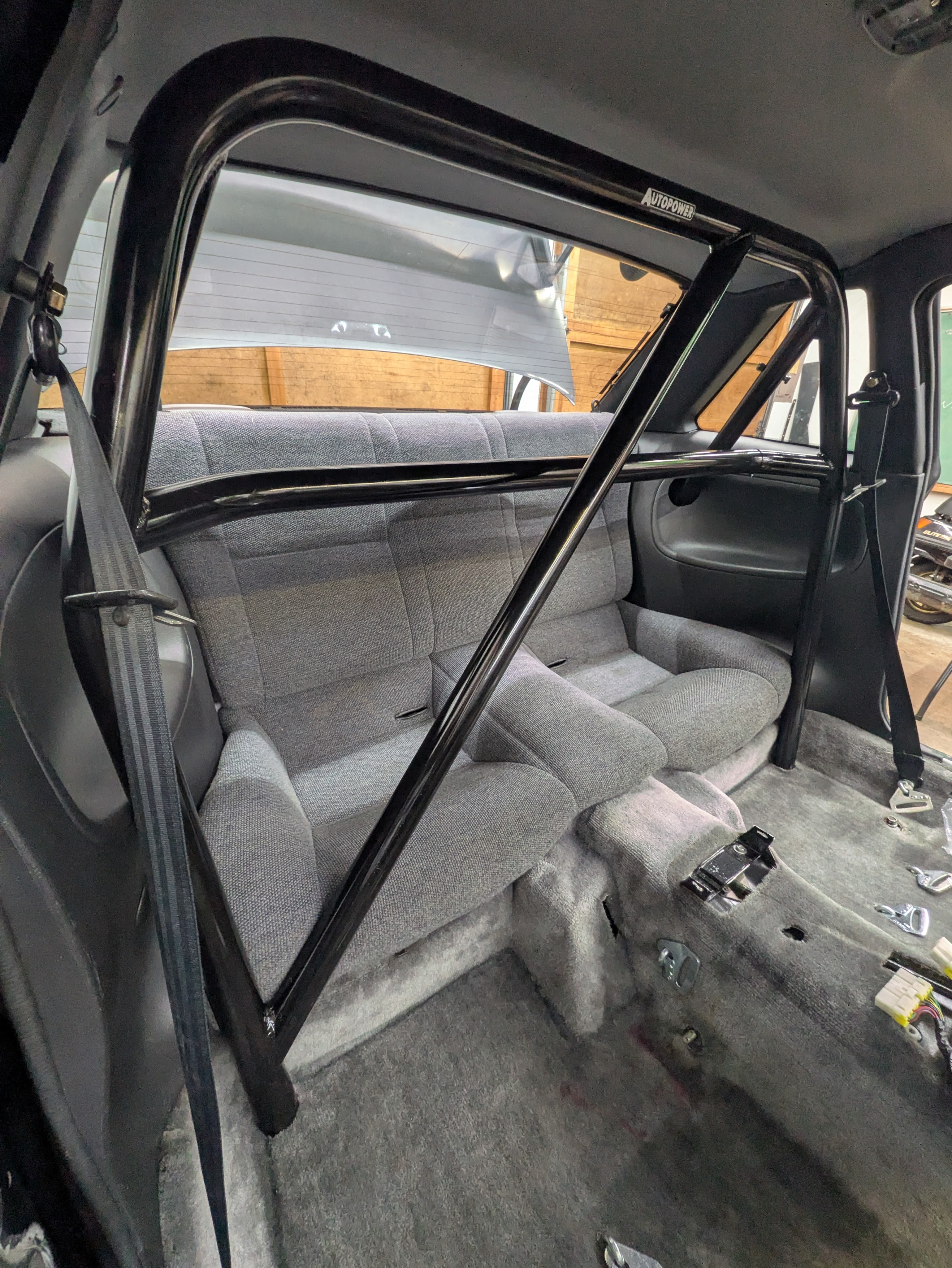 I threw the back seats in to get a visual of the completed final product. While its still a 35 year old car with 35 year old parts, I am elated with how it came out. It looks like a factory built Clubsport with the trimmed panels and carpet for the cage and the properly capped rear belts. It is clean and purposeful, and the Recaros and harnesses will complete the look.